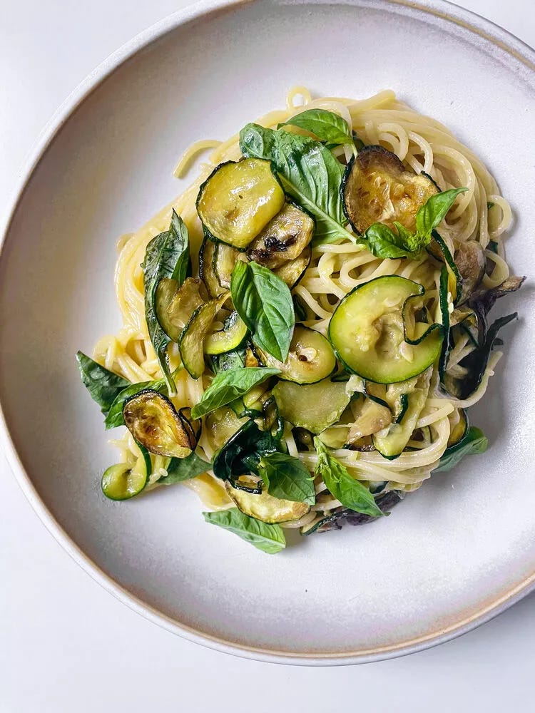I developed this zucchini spaghetti few years ago for an olive oil brand, and it deserves a bit more attention. It’s *very* inspired by the Amalfi classic Spaghetti alla Nerano, with less oil to clean up. You may have seen Stanley Tucci make it on his CNN show, and we love him for that. I’ve seen versions with Pecorino or even provolone, but if you’re like me, you usually have Parm in the fridge. It’s one of those dishes that looks like nothing special but tastes much more complex. If you have time, dry the zucchini very well before cooking it in batches for the best color. If you can’t be bothered, it will still be good.